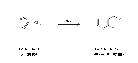 2.通過3-甲基噻吩合成2-溴-3-(溴甲基)噻吩,收率約76%;