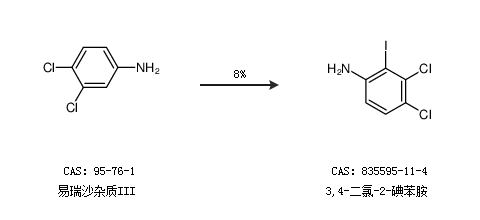 1.通過(guò)易瑞沙雜質(zhì)III合成3,4-二氯-2-碘苯胺,收率約8%;
