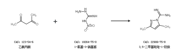2.通過(guò)乙酰丙酮和1-氨基-3-硝基胍合成3,5-二甲基吡唑-1-羧胺