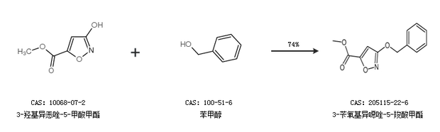 2.通過3-羥基異惡唑-5-甲酸甲酯和苯甲醇合成3-芐氧基異噁唑-5-羧酸甲酯,收率約74%;
