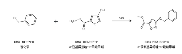 1.通過溴化芐和3-羥基異惡唑-5-甲酸甲酯合成3-芐氧基異噁唑-5-羧酸甲酯,收率約59%;
