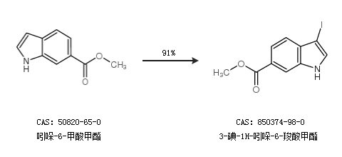 1.通過吲哚-6-甲酸甲酯合成3-碘-1H-吲哚-6-羧酸甲酯,收率約91%;