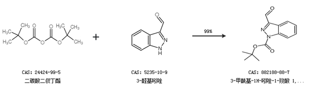 1.通過二碳酸二叔丁酯和3-醛基吲唑合成3-甲?;?1H-吲唑-1-羧酸 1,1-二甲基乙酯,收率約99%;