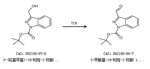 2.通過3-(羥基甲基)-1H-吲唑-1-羧酸,1,1-二甲基乙酯合成3-甲?;?1H-吲唑-1-羧酸 1,1-二甲基乙酯,收率約71%;