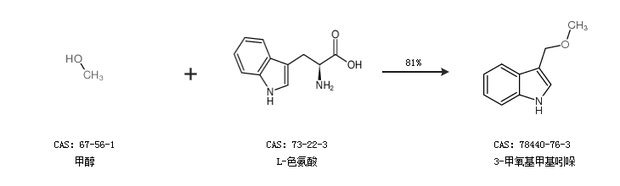 1.通過甲醇和L-色氨酸合成3-甲氧基甲基吲哚,收率約81%;