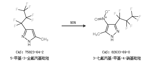 1.通過5-甲基-3-全氟丙基吡唑合成3-七氟丙基-甲基-4-硝基吡唑,收率約90%;