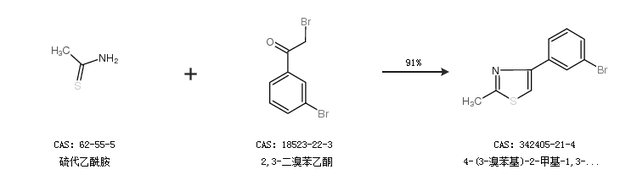 1.通過(guò)硫代乙酰胺和2,3-二溴苯乙酮合成4-(3-溴苯基)-2-甲基-1,3-噻唑,收率約91%;
