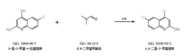 2.通過6-氯-2-甲基-4-羥基喹啉和N,N-二甲基甲酰胺合成4,6-二氯-2-甲基喹啉,收率約12%;