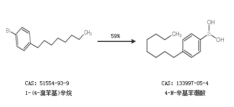 1.通過1-(4-溴苯基)辛烷合成4-N-辛基苯硼酸,收率約59%;