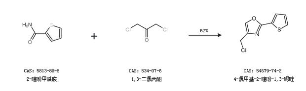 1.通過2-噻吩甲酰胺和1,3-二氯丙酮合成4-氯甲基-2-噻吩-1,3-噁唑,收率約62%;