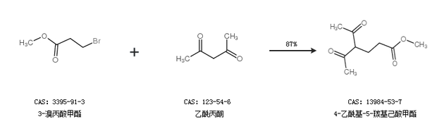 2.通過3-溴丙酸甲酯和乙酰丙酮合成4-乙酰基-5-羰基己酸甲酯,收率約87%;