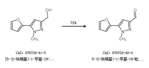 1.通過[5-(2-呋喃基)-1-甲基-1H-吡唑-3-基]甲醇合成5-(2-呋喃基)-1-甲基-1H-吡唑-3-甲醛,收率約72%;