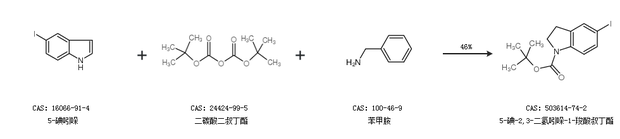 1.通過(guò)5-碘吲哚、二碳酸二叔丁酯和苯甲胺合成5-碘-2,3-二氫吲哚-1-羧酸叔丁酯,收率約46%;