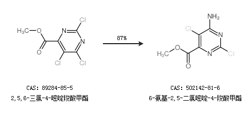 1.通過2,5,6-三氯-4-嘧啶羧酸甲酯合成6-氨基-2,5-二氯嘧啶-4-羧酸甲酯,收率約87%;