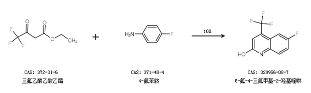 2.通過(guò)三氟乙酰乙酸乙酯和4-氟苯胺合成6-氟-4-三氟甲基-2-羥基喹啉,收率約10%;