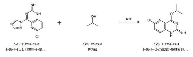 1.通過6-氯-4-[1,2,4]噻唑-1-基-吡啶并[3,2-d]嘧啶-2-基-胺和異丙醇合成6-氯-4-(2-丙氧基)-吡啶并[3,2-d]嘧啶-2-胺,收率約65%;
