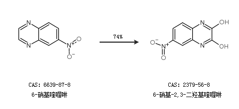 1.通過(guò)6-硝基喹喔啉合成6-硝基-2,3-二羥基喹喔啉,收率約74%;