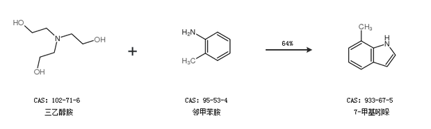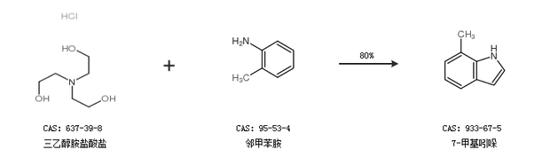 2.通過三乙醇胺鹽酸鹽和鄰甲苯胺合成7-甲基吲哚,收率約80%;