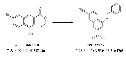 1.通過7-溴-4-羥基-2-萘羧酸乙酯合成7-氰基-4-(苯基甲氧基)-2-萘羧酸