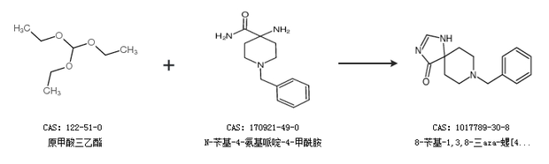 1.通過(guò)原甲酸三乙酯和N-芐基-4-氨基哌啶-4-甲酰胺合成8-芐基-1,3,8-三aza-螺[4.5]-1-癸烯-4-酮