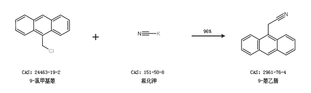 1.通過9-氯甲基蒽和氰化鉀合成9-蒽乙腈,收率約96%;