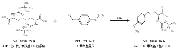 2.通過N,N’-雙(叔丁氧羰基)-L-胱氨酸和4-甲氧基氯芐合成Boc-S-(4-甲氧基芐基)-L-半胱氨酸,收率約68%;