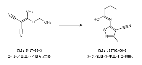 2.通過2-(1-乙氧基亞乙基)丙二腈合成N-(4-氰基-3-甲基-1,2-噻唑-5-基)丁酰胺