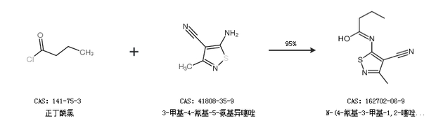 1.通過正丁酰氯和3-甲基-4-氰基-5-氨基異噻唑合成N-(4-氰基-3-甲基-1,2-噻唑-5-基)丁酰胺,收率約95%;