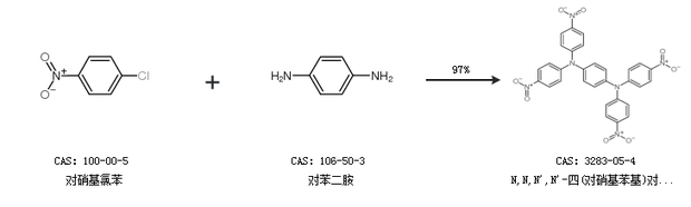 1.通過對硝基氯苯和對苯二胺合成N,N,N'',N''-四(對硝基苯基)對苯二胺,收率約97%;
