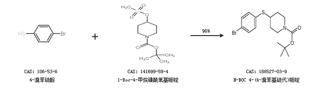 1.通過4-溴苯硫酚和1-Boc-4-甲烷磺酰氧基哌啶合成N-BOC 4-(4-溴苯基硫代)哌啶,收率約96%;