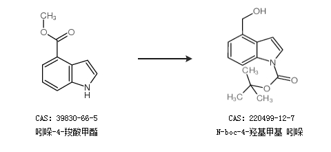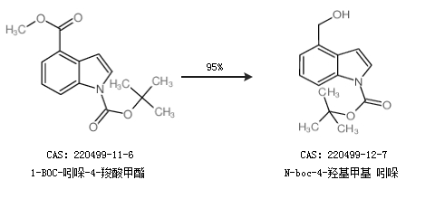 1.通過1-BOC-吲哚-4-羧酸甲酯合成N-boc-4-羥基甲基 吲哚,收率約95%;