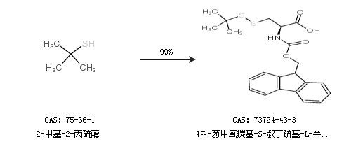 1.通過2-甲基-2-丙硫醇合成Nα-芴甲氧羰基-S-叔丁硫基-L-半胱氨酸,收率約99%;