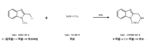 1.通過(guò)2-(氯甲基)-1-甲基-1H-苯并咪唑和甲胺合成N-甲基-n-[(1-甲基-1H-苯并咪唑-2-基)甲基]胺鹽酸鹽,收率約87%;