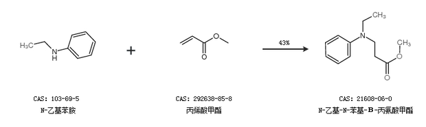1.通過N-乙基苯胺和丙烯酸甲酯合成N-乙基-N-苯基-Β-丙氨酸甲酯,收率約43%;