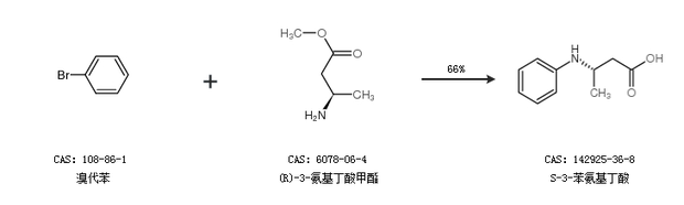 2.通過溴代苯和(R)-3-氨基丁酸甲酯合成S-3-苯氨基丁酸,收率約66%;