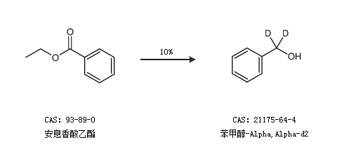 1.通過(guò)安息香酸乙酯合成苯甲醇-Alpha,Alpha-d2,收率約10%;