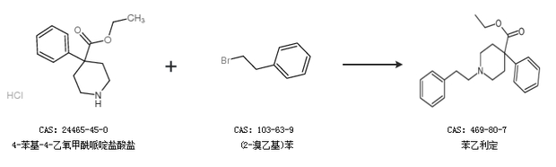 2.通過4-苯基-4-乙氧甲酰哌啶鹽酸鹽和(2-溴乙基)苯合成苯乙利定