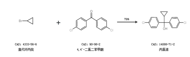 1.通過溴代環(huán)丙烷和4,4''-二氯二苯甲酮合成丙氯諾,收率約79%;