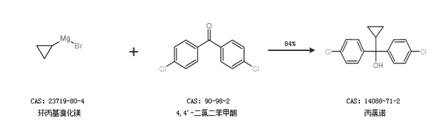 2.通過環(huán)丙基溴化鎂和4,4''-二氯二苯甲酮合成丙氯諾,收率約84%;