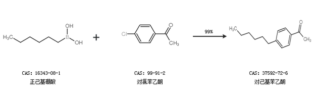 1.通過(guò)正己基硼酸和對(duì)氯苯乙酮合成對(duì)己基苯乙酮,收率約99%;