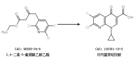 1.通過2,6-二氯-5-氟煙酰乙酸乙酯合成環(huán)丙基萘啶羧酸