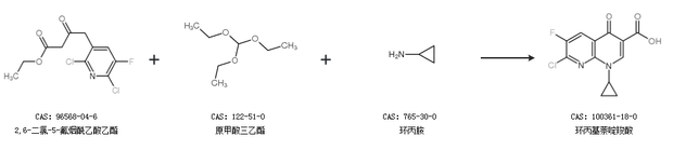 2.通過2,6-二氯-5-氟煙酰乙酸乙酯、原甲酸三乙酯和環(huán)丙胺合成環(huán)丙基萘啶羧酸