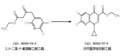 2.通過2,6-二氯-5-氟煙酰乙酸乙酯合成環(huán)丙基萘啶羧酸乙酯