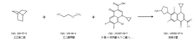 2.通過(guò)三乙烯二胺、乙二醇甲醚和8-氯-1-環(huán)丙基-6,7-二氟-1,4-二氫-4-氧代-3-喹啉羧酸合成克林沙星