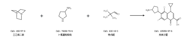 1.通過(guò)三乙烯二胺、3-氨基吡咯烷和特戊醛合成克林沙星