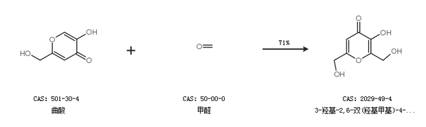 1.通過曲酸和甲醛合成3-羥基-2,6-雙(羥基甲基)-4-吡喃酮,收率約71%;