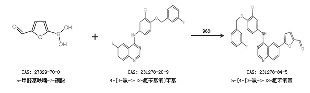 2.通過(guò)5-甲醛基呋喃-2-硼酸合成5-[4-[3-氯-4-(3-氟苯氧基)苯胺基]-6-喹唑啉基]呋喃-2-甲醛,收率約94%;