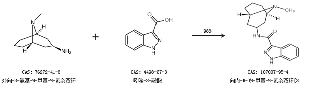 1.通過外向-3-氨基-9-甲基-9-氮雜雙環(huán)[3,3,1]壬烷和吲唑-3-羧酸合成向內(nèi)-N-(9-甲基-9-氮雜雙環(huán)[3.3.1]壬烷-3基)-1H-吲唑-3-甲酰胺,收率約98%;