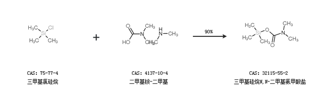 1.通過三甲基氯硅烷和二甲基銨-二甲基合成三甲基硅烷N,N-二甲基氨甲酸鹽,收率約90%;