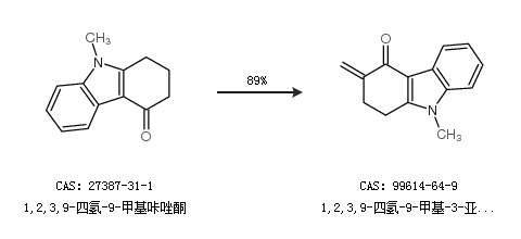 2.通過(guò)1,2,3,9-四氫-9-甲基咔唑酮合成1,2,3,9-四氫-9-甲基-3-亞甲咔唑酮,收率約89%;